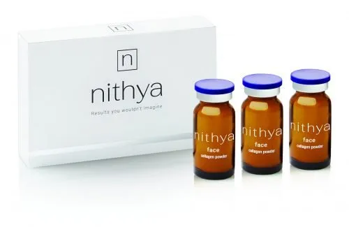 Nithya Collagen Powder 3 x 70mg is a sterile type I collagen for professional mesotherapy. It boosts skin regeneration, smooths fine lines, and improves elasticity.